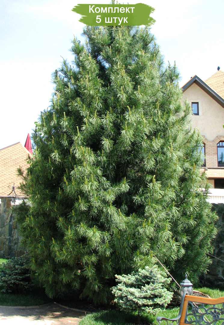 Пакет из пяти саженцев корейского кедра размером от 60 до 100 см предлагается по привлекательной цене, эквивалентной стоимости четырех саженцев. Корейский кедр известен своей мощной, плотной кроной, которая у молодых деревьев имеет форму округлого яйца, а у зрелых принимает цилиндрическую или коническую форму. С возрастом на деревьях может появляться несколько вершин, что может быть вызвано несколькими причинами, включая естественное стремление дерева к максимизации поглощения питательных веществ и увеличению количества шишек. Также считается, что вершины могут обламываться под весом шишек или повреждаться медведями, которые лазают по деревьям в поисках шишек.
