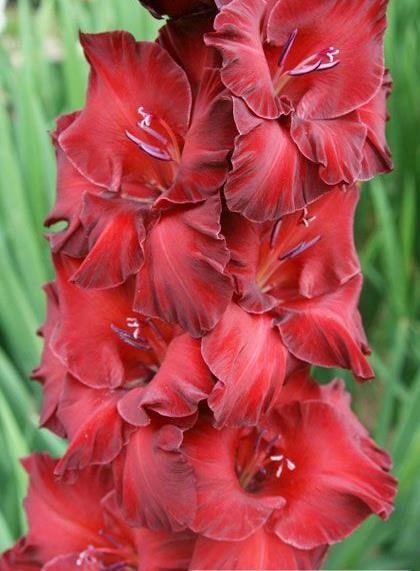 Гладиолус "Рубиновый Браслет" - это великолепные цветы глубокого тёмно-красного оттенка с округлыми лепестками. Центр цветка открыт, а лёгкая гофрировка лепестков становится более выраженной к краям. Одновременно на одном стебле может распуститься до 8-9 цветков. Стебель крепкий, высокий и стройный, что делает этот сорт особенно привлекательным для садоводов.